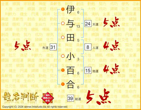 生活面を象徴する運勢です。外部から受ける影響力を表し、結婚運、家庭運や職場、環境への順応性を表します。総運から人運を引いた画数。姓や名が1文字の場合を除く。