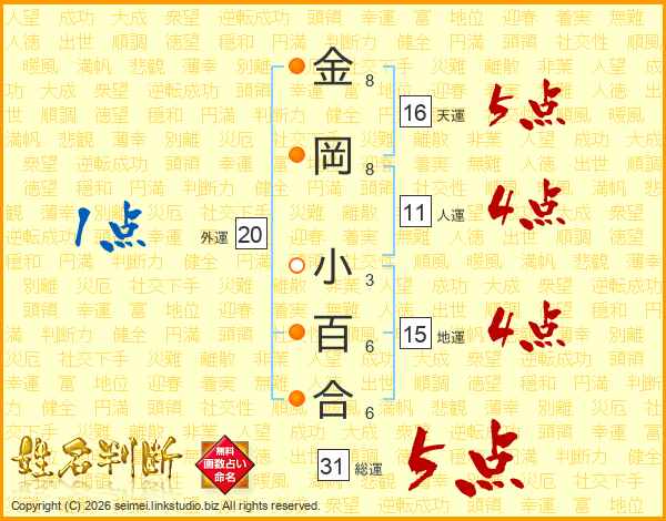 金(8画)岡(8画) 小(3画)百(6画)合(6画)