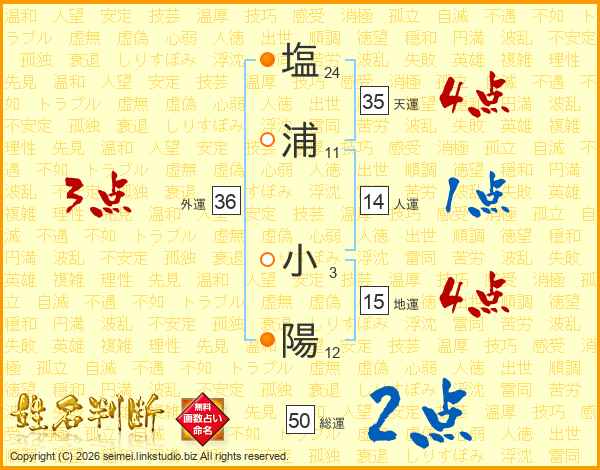 塩(24画)浦(11画) 小(3画)陽(12画)