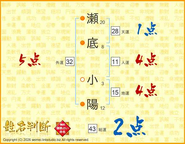 瀬(20画)底(8画) 小(3画)陽(12画)