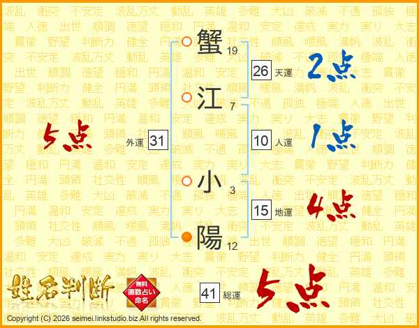 蟹江小陽さんの総運は41画の5点!