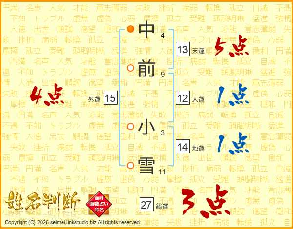 生活面を象徴する運勢です。外部から受ける影響力を表し、結婚運、家庭運や職場、環境への順応性を表します。総運から人運を引いた画数。姓や名が1文字の場合を除く。