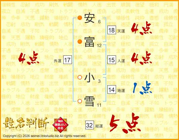 生活面を象徴する運勢です。外部から受ける影響力を表し、結婚運、家庭運や職場、環境への順応性を表します。総運から人運を引いた画数。姓や名が1文字の場合を除く。