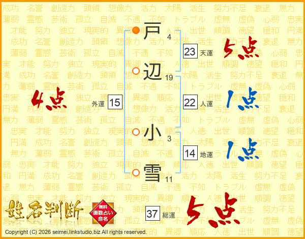 戸(4画)辺(19画) 小(3画)雪(11画)