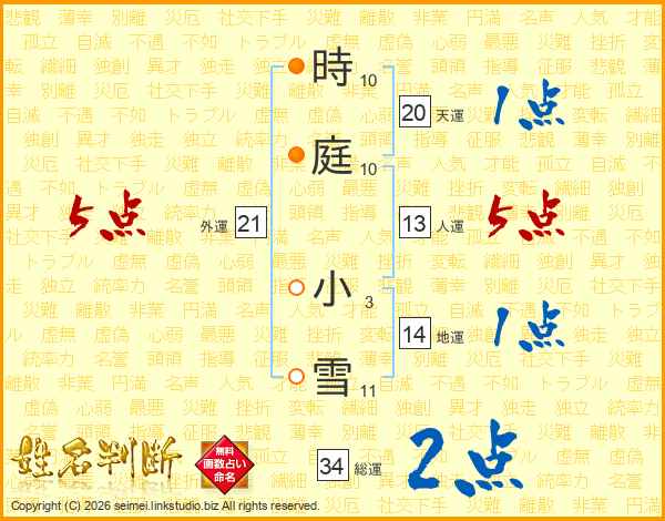 生活面を象徴する運勢です。外部から受ける影響力を表し、結婚運、家庭運や職場、環境への順応性を表します。総運から人運を引いた画数。姓や名が1文字の場合を除く。