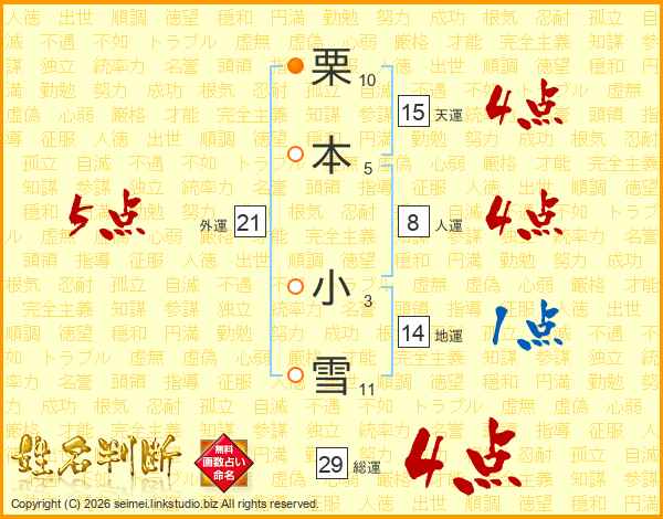 生活面を象徴する運勢です。外部から受ける影響力を表し、結婚運、家庭運や職場、環境への順応性を表します。総運から人運を引いた画数。姓や名が1文字の場合を除く。