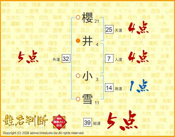 櫻井小雪さんの総運は39画の5点!