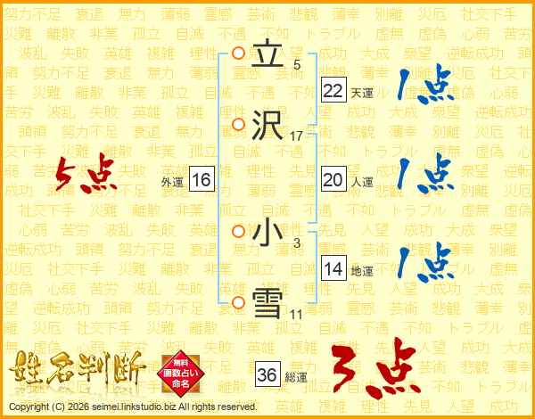 生活面を象徴する運勢です。外部から受ける影響力を表し、結婚運、家庭運や職場、環境への順応性を表します。総運から人運を引いた画数。姓や名が1文字の場合を除く。