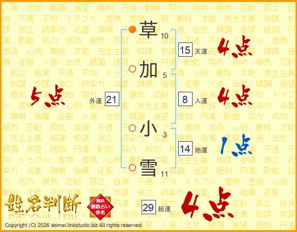 生活面を象徴する運勢です。外部から受ける影響力を表し、結婚運、家庭運や職場、環境への順応性を表します。総運から人運を引いた画数。姓や名が1文字の場合を除く。