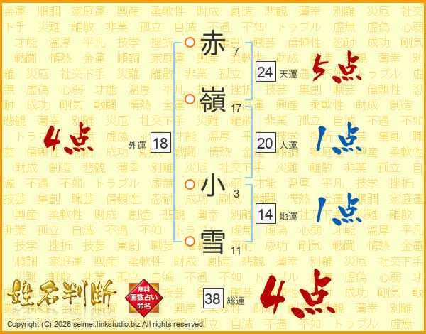 赤(7画)嶺(17画) 小(3画)雪(11画)