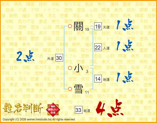 生活面を象徴する運勢です。外部から受ける影響力を表し、結婚運、家庭運や職場、環境への順応性を表します。総運から人運を引いた画数。姓や名が1文字の場合を除く。