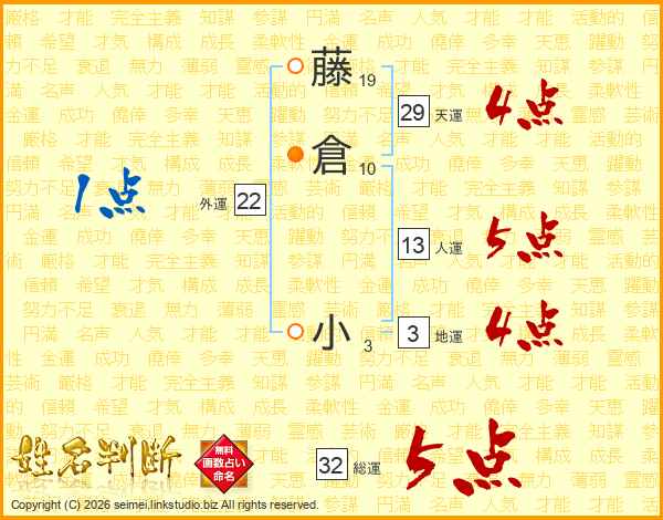 生活面を象徴する運勢です。外部から受ける影響力を表し、結婚運、家庭運や職場、環境への順応性を表します。総運から人運を引いた画数。姓や名が1文字の場合を除く。