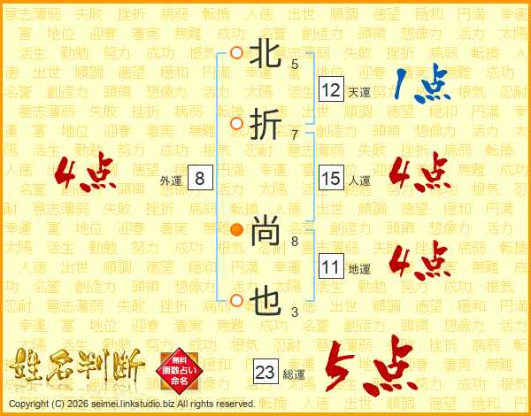 北折尚也さんの総運は23画の5点!