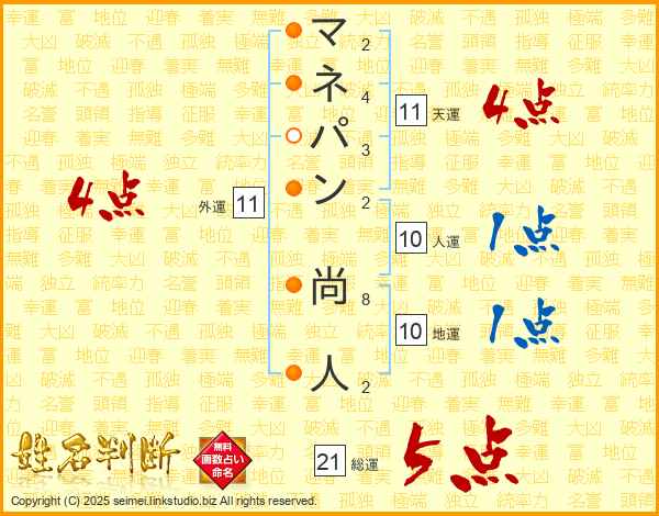 マ(2画)ネ(4画)パ(3画)ン(2画) 尚(8画)人(2画)