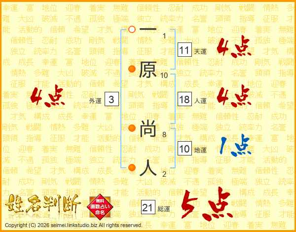 あなたの人生を表す1番重要な運勢です。生涯を通じて影響する総合運となり、主に50歳以降の晩年期に影響を及ぼします。苗字と名前の合計画数。