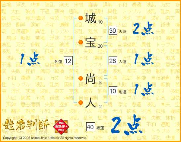生活面を象徴する運勢です。外部から受ける影響力を表し、結婚運、家庭運や職場、環境への順応性を表します。総運から人運を引いた画数。姓や名が1文字の場合を除く。