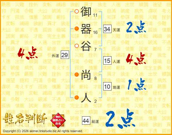御器谷尚人さんの総運は44画の2点!
