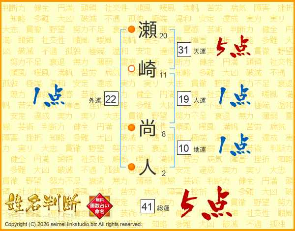 瀬(20画)崎(11画) 尚(8画)人(2画)
