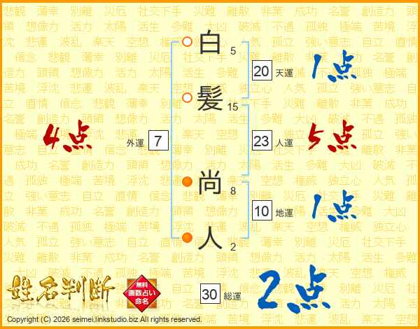 白(5画)髪(15画) 尚(8画)人(2画)