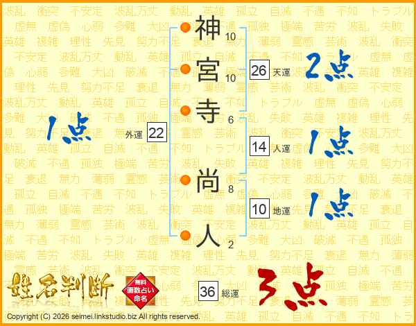 神(10画)宮(10画)寺(6画) 尚(8画)人(2画)