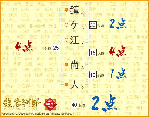 鐘(20画)ケ(3画)江(7画) 尚(8画)人(2画)