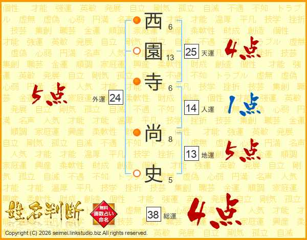西(6画)園(13画)寺(6画) 尚(8画)史(5画)
