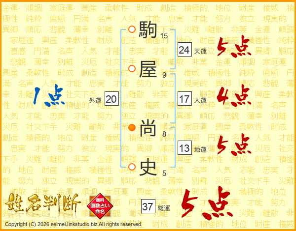 駒屋尚史さんの総運は37画の5点!