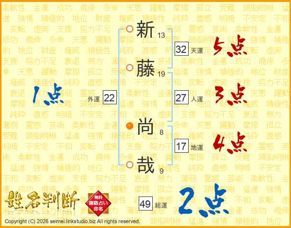 新(13画)藤(19画) 尚(8画)哉(9画)