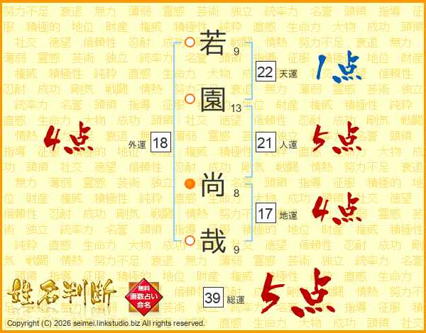 若(9画)園(13画) 尚(8画)哉(9画)