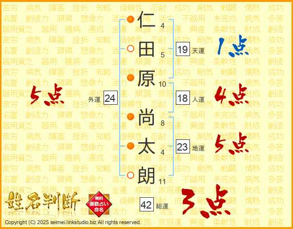 仁(4画)田(5画)原(10画) 尚(8画)太(4画)朗(11画)