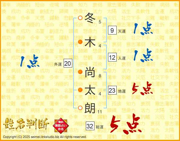 冬(5画)木(4画) 尚(8画)太(4画)朗(11画)