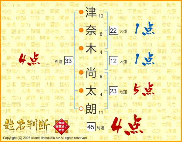 津奈木尚太朗さんの総運は45画の4点!