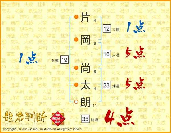 片(4画)岡(8画) 尚(8画)太(4画)朗(11画)