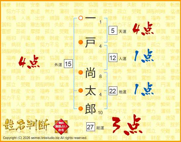 一(1画)戸(4画) 尚(8画)太(4画)郎(10画)