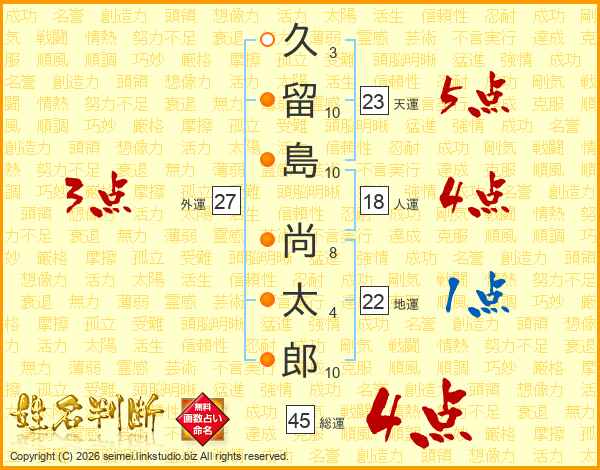 久(3画)留(10画)島(10画) 尚(8画)太(4画)郎(10画)