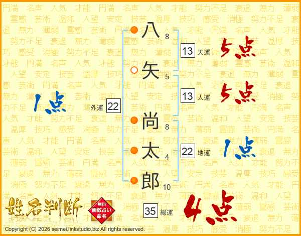 八(8画)矢(5画) 尚(8画)太(4画)郎(10画)