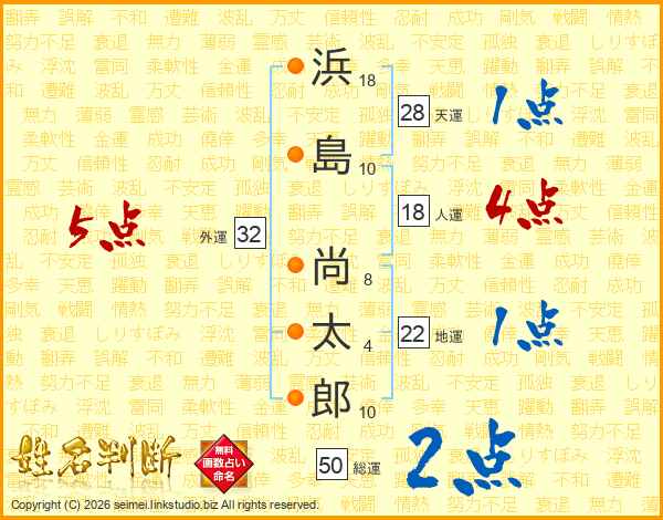 浜(18画)島(10画) 尚(8画)太(4画)郎(10画)