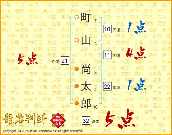 町(7画)山(3画) 尚(8画)太(4画)郎(10画)