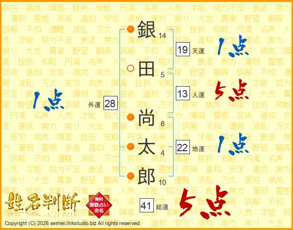銀(14画)田(5画) 尚(8画)太(4画)郎(10画)