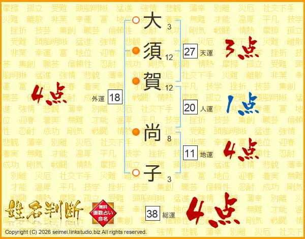 大(3画)須(12画)賀(12画) 尚(8画)子(3画)