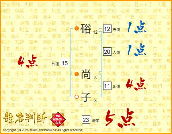 生活面を象徴する運勢です。外部から受ける影響力を表し、結婚運、家庭運や職場、環境への順応性を表します。総運から人運を引いた画数。姓や名が1文字の場合を除く。
