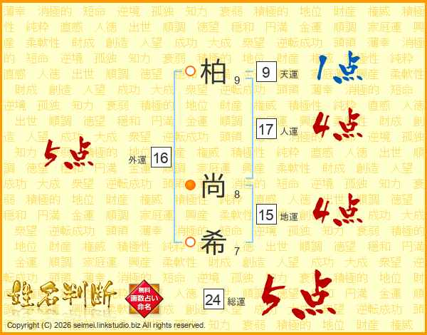生活面を象徴する運勢です。外部から受ける影響力を表し、結婚運、家庭運や職場、環境への順応性を表します。総運から人運を引いた画数。姓や名が1文字の場合を除く。