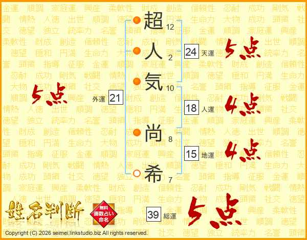 超(12画)人(2画)気(10画) 尚(8画)希(7画)