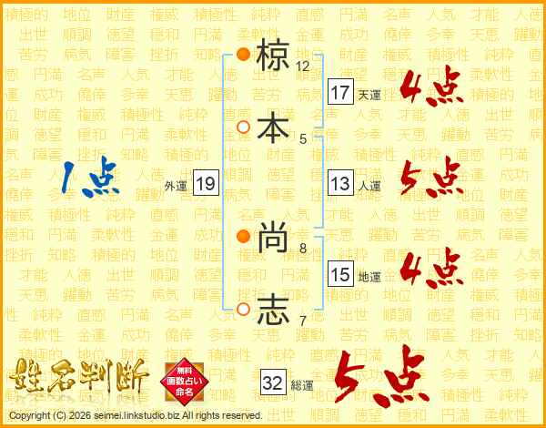 椋本尚志さんの総運は32画の5点!