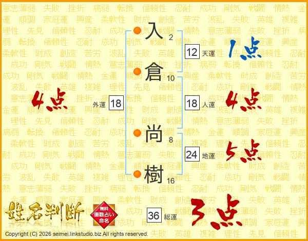 入倉尚樹さんの総運は36画の3点!