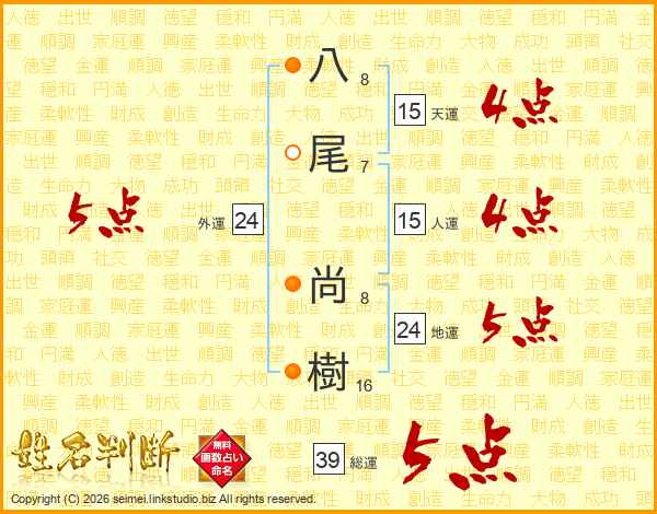 八尾尚樹さんの総運は39画の5点!
