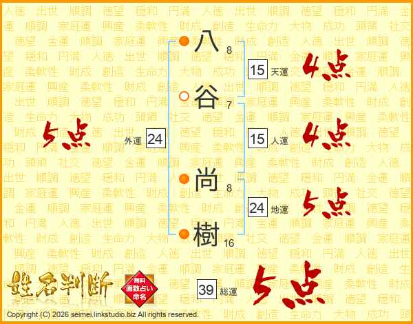 八(8画)谷(7画) 尚(8画)樹(16画)