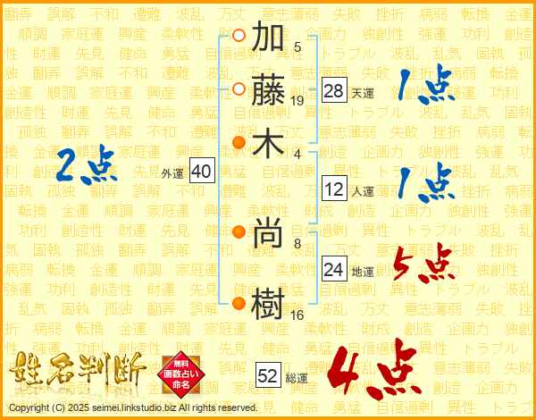 加(5画)藤(19画)木(4画) 尚(8画)樹(16画)
