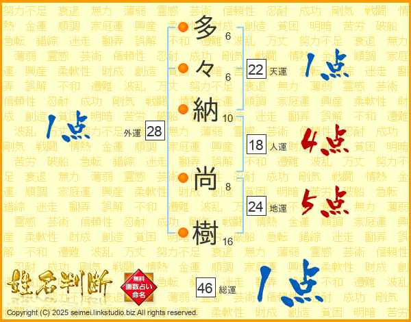 多(6画)々(6画)納(10画) 尚(8画)樹(16画)