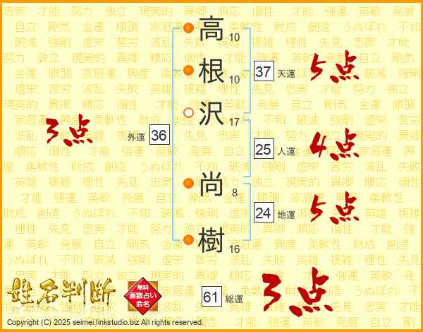 高(10画)根(10画)沢(17画) 尚(8画)樹(16画)